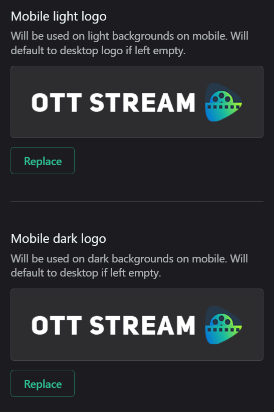 • Upload light and dark logos for desktop and mobile versions: Having separate logos ensures your branding looks great in all modes and on all devices. Consider how your logo will look against different background colors. The light logo will be used on dark backgrounds. The dark logo will be used on light backgrounds. If the section is left empty, the platform will automatically apply the default logo to the light logo. The same applies for the mobile logos.